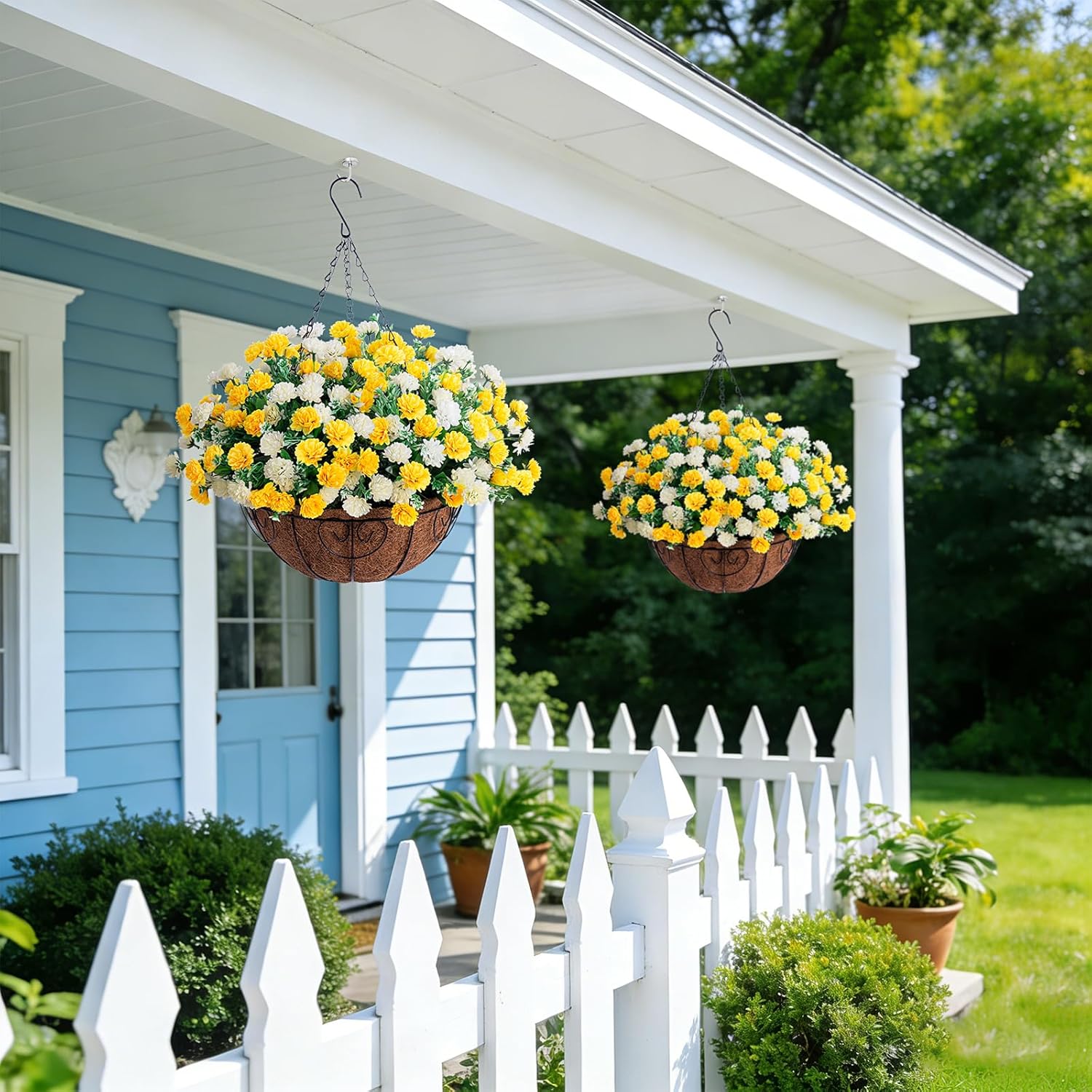 Artificial Fake Hanging Flowers Plants for Outdoor Spring Decoration,2 PCS Faux Silk Daisy with Eucalyptus Leaves,UV Resistant Look Real for Outside Home Indoor Planter Porch Patio Balcony Yard Decor