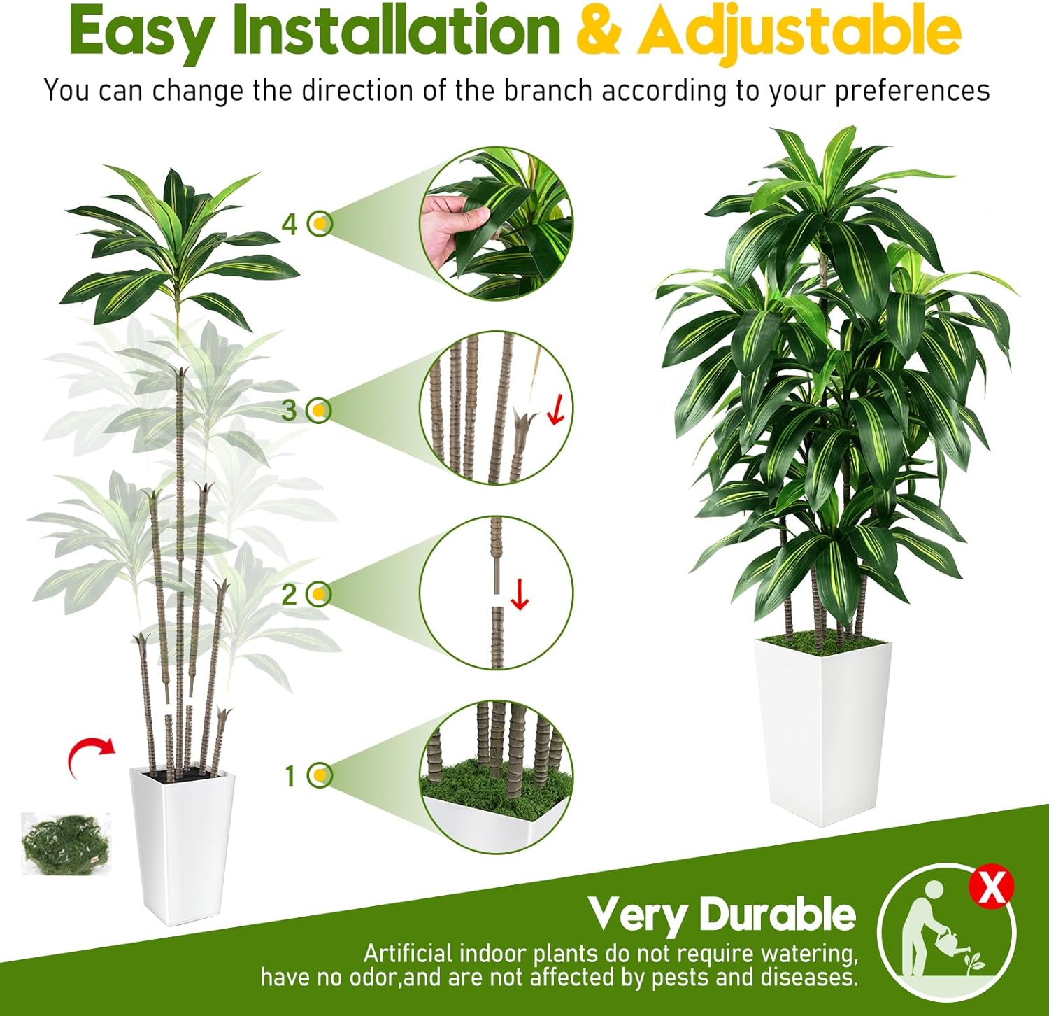Artificial Dracaena Plant Indoor 5FT - Fake Tree with White Tall Planter - Faux Yucca Tall Fake Floor Plant in Pot - Artificial Trees for Home Office Living Room Decor Indoor